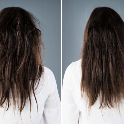 Left: Unfiltered‑water hair after a few weeks of use – the strands appear dull, unevenly coloured, and prone to frizz. The chlorine and mineral buildup has stripped natural oils, leaving the hair brittle, difficult to manage, and with noticeable split ends.